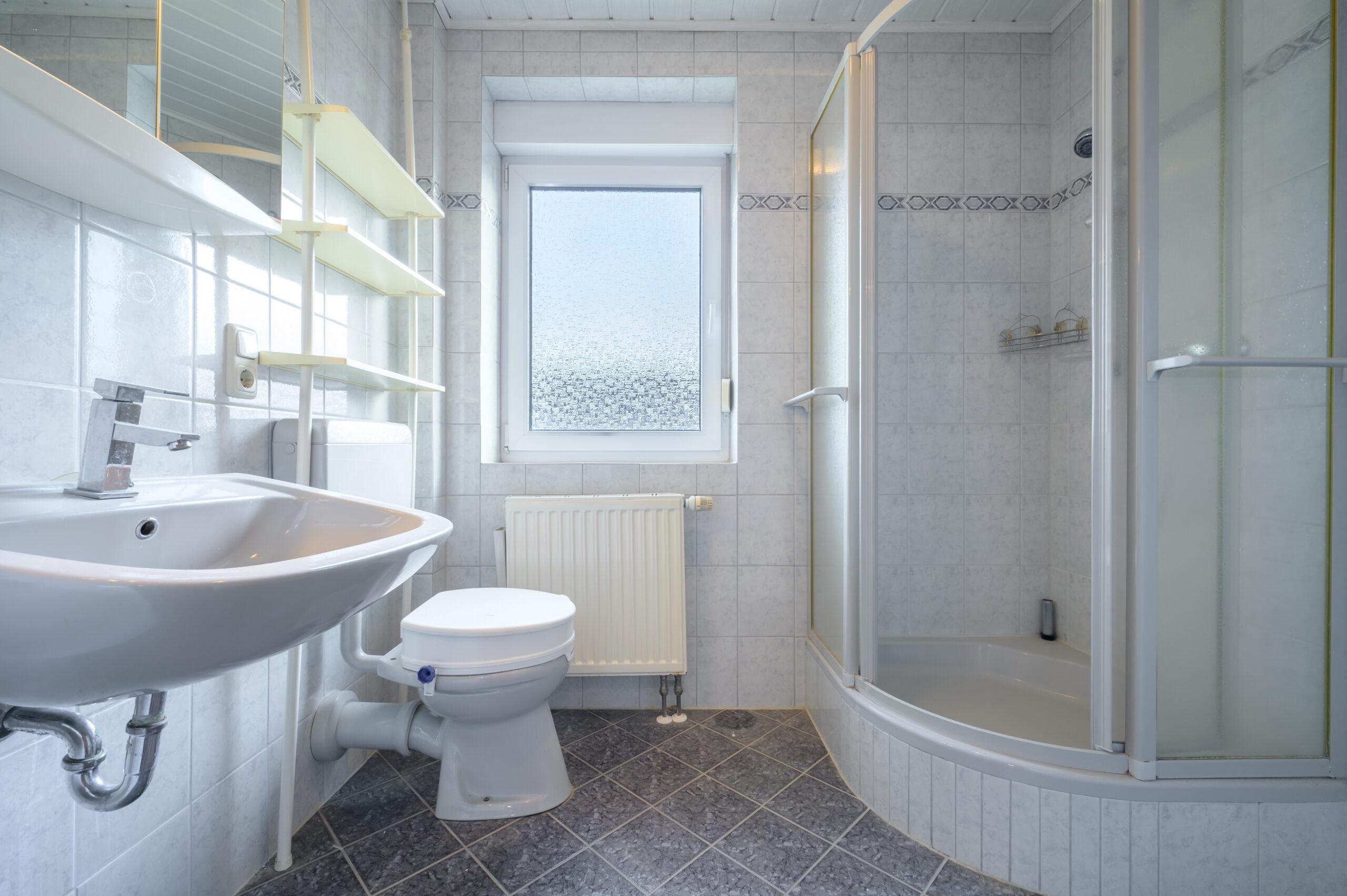 Im ersten OG befinden sich drei Schlafzimmer, eines davon mit großem Balkon. Ebenso gibt es dort auch ein Duschbadezimmer mit Fenster.