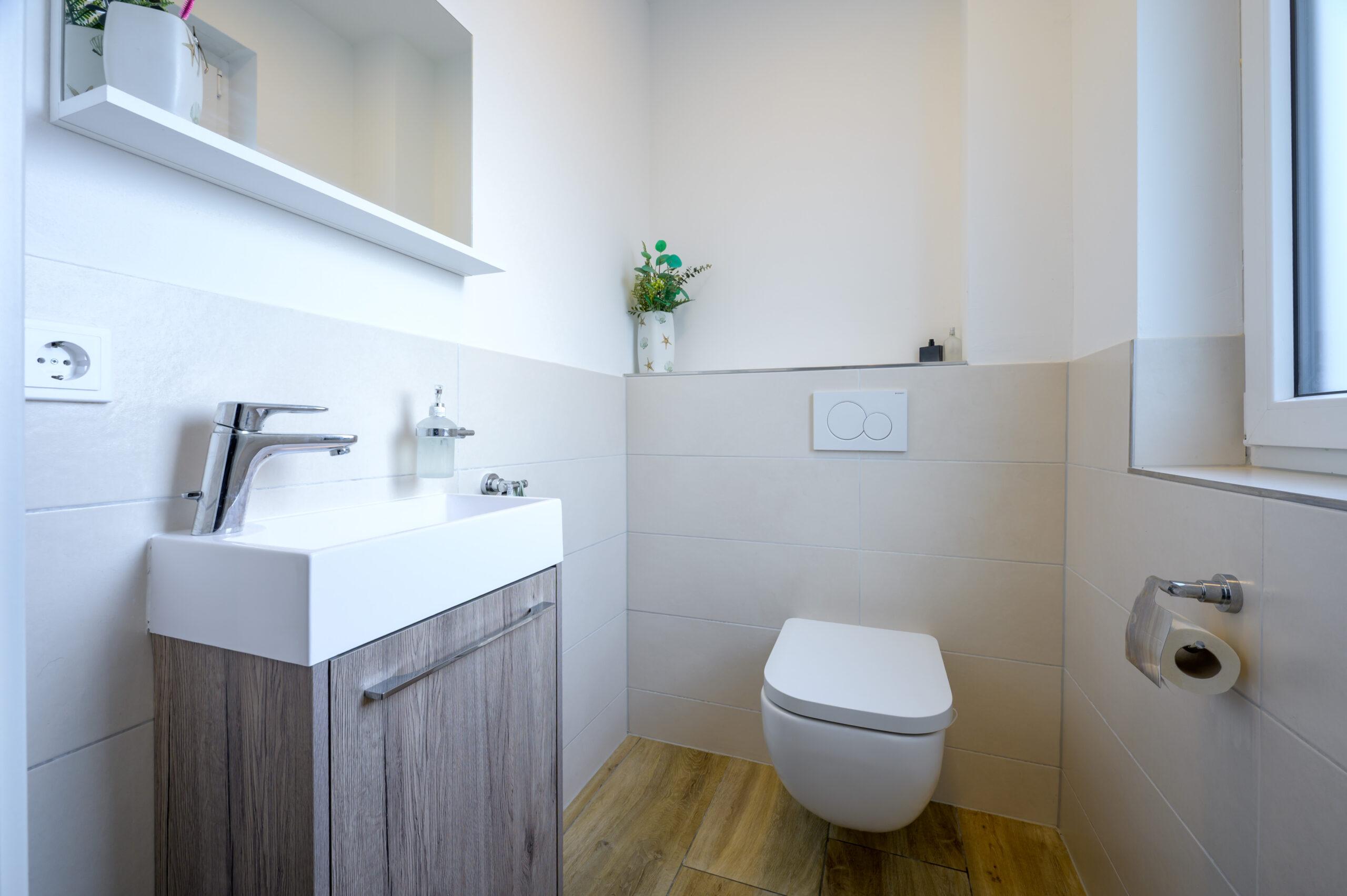Der Eingangsbereich empfängt Sie mit einer hellen Diele, von der aus das Gäste-WC, der Hauswirtschaftsraum sowie ein flexibel nutzbares Arbeits- oder Gästezimmer im Erdgeschoss erreichbar sind – ideal für Homeoffice oder Besuch.