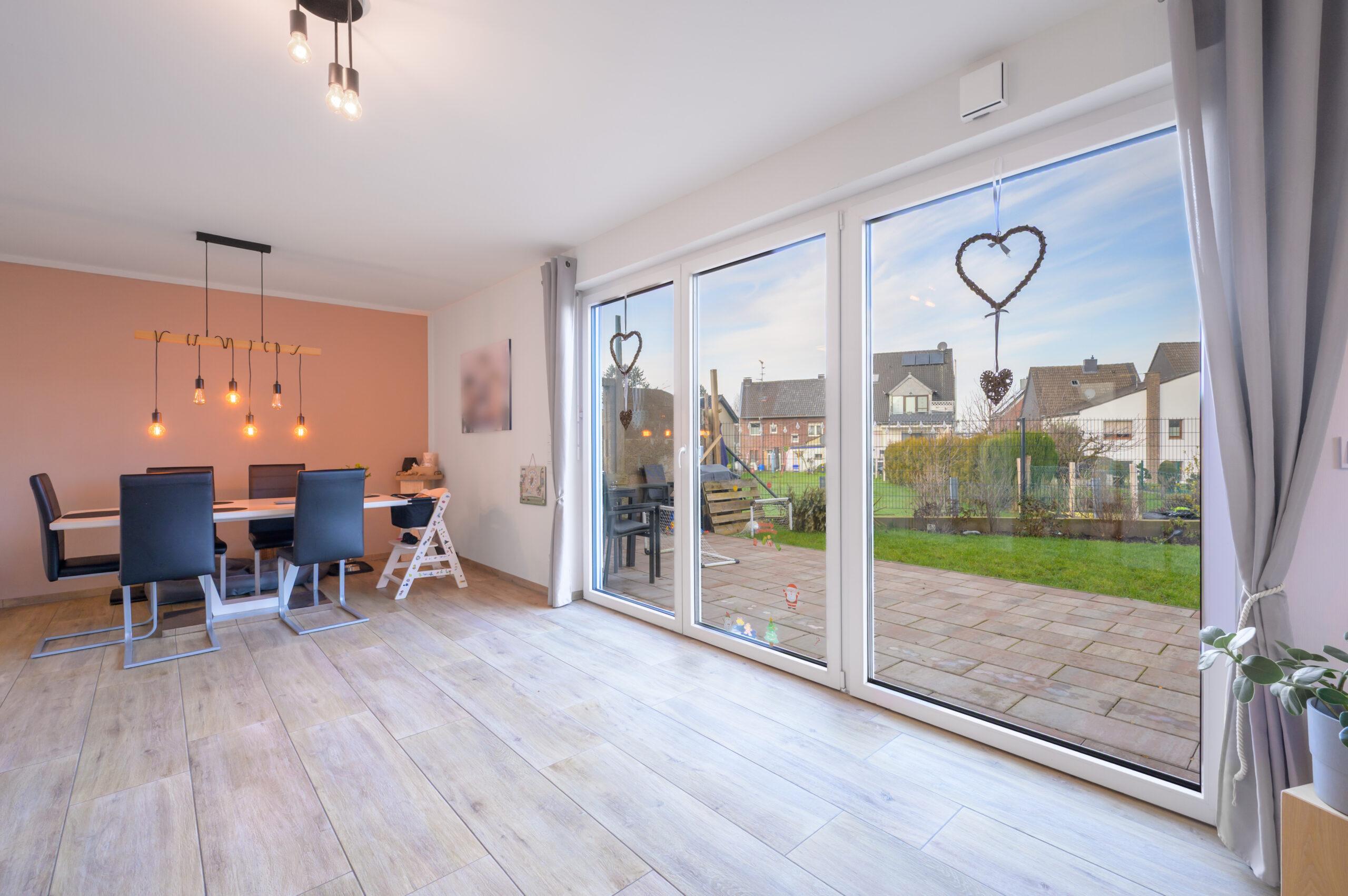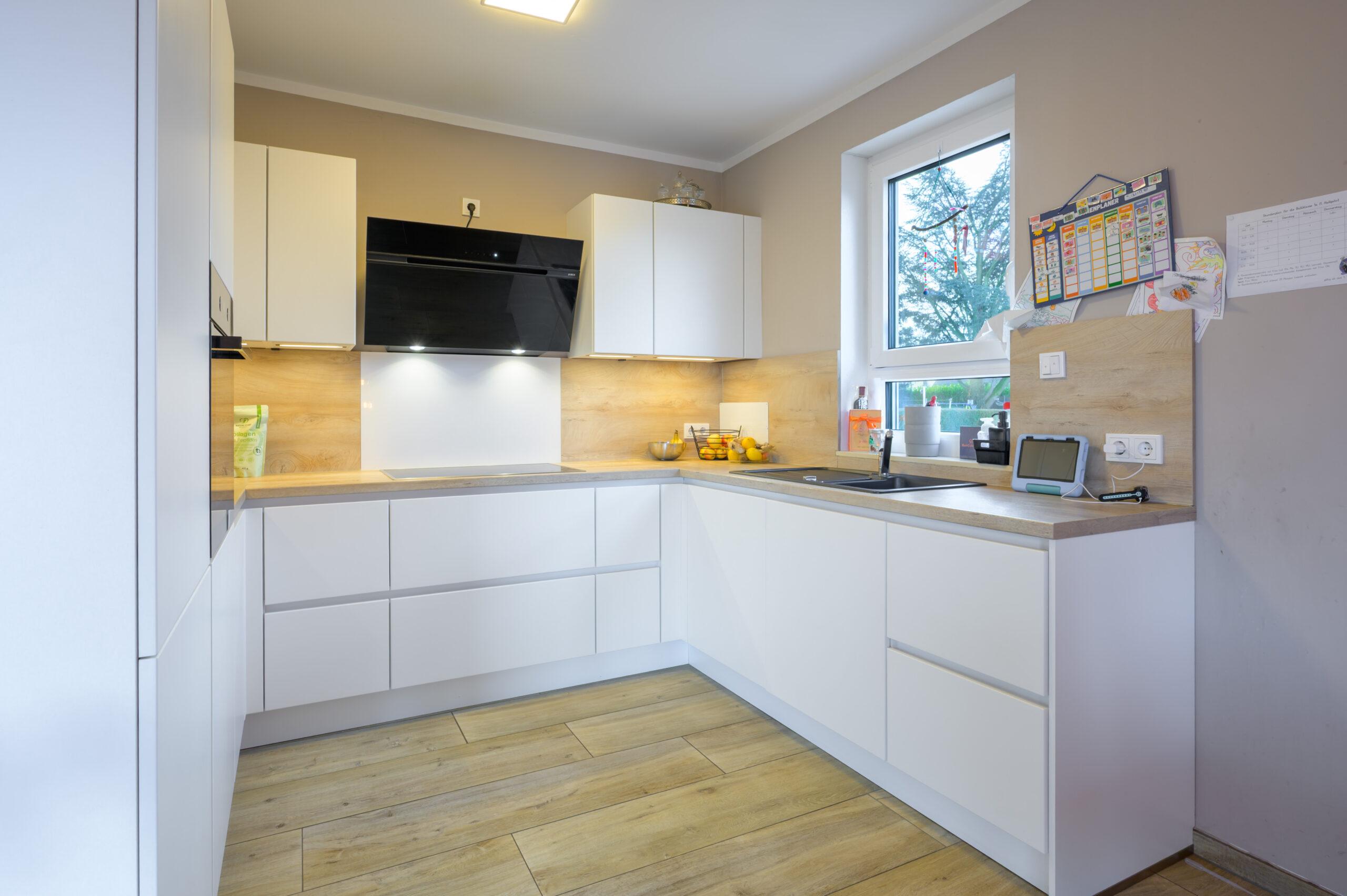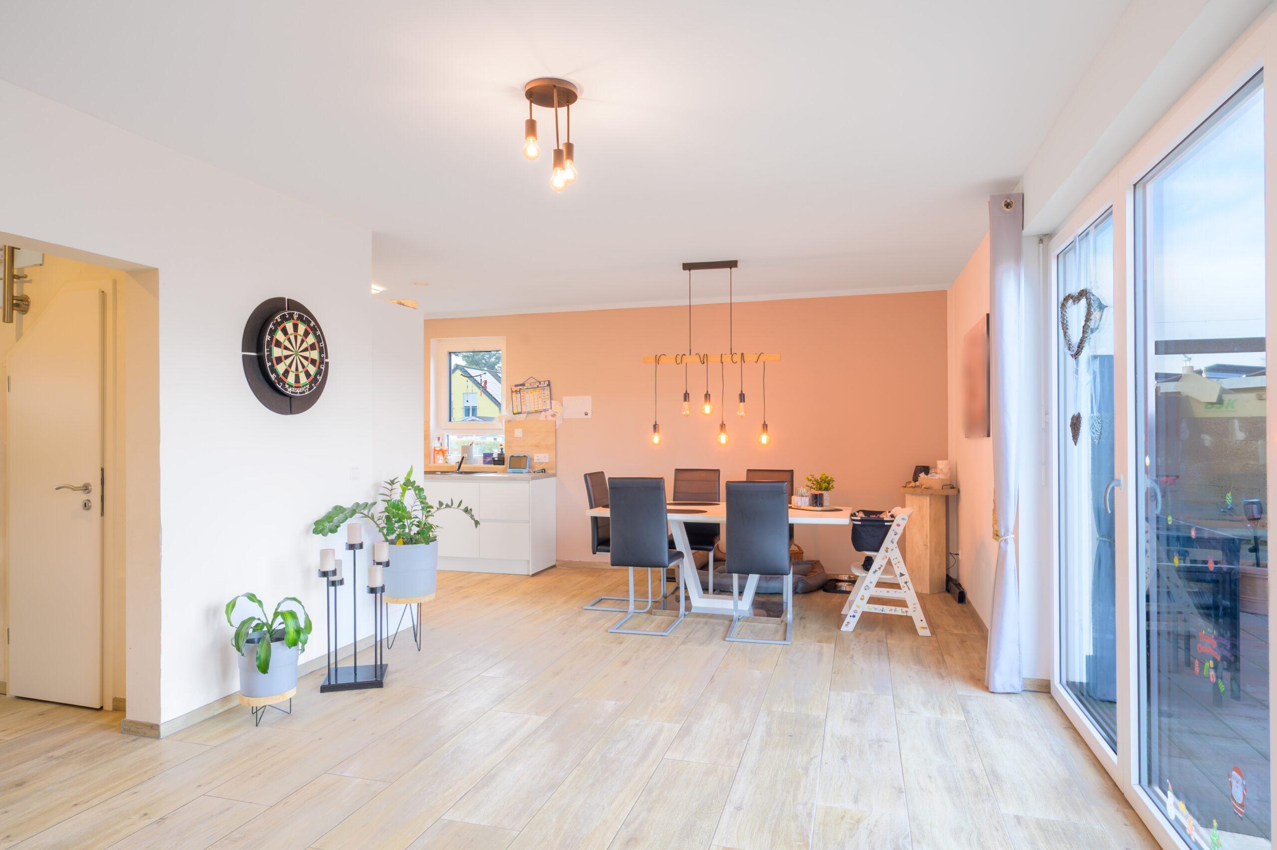 Das Herzstück des Hauses bildet der großzügige Wohn-, Ess- und Kochbereich mit offener Gestaltung. Große Fensterflächen sorgen für ein lichtdurchflutetes Wohnambiente und schaffen eine angenehme Verbindung zwischen Innen- und Außenbereich. Die moderne Einbauküche ist harmonisch integriert und bietet funktionale Arbeitsflächen sowie ausreichend Stauraum. Vom Wohnbereich aus gelangen Sie direkt auf die Terrasse und in den gepflegten Garten – ideal für entspannte Stunden im Freien oder gesellige Abende.