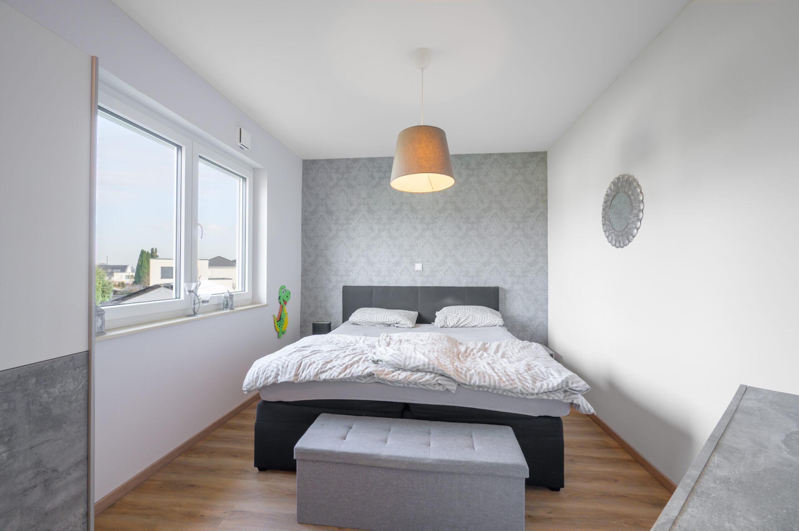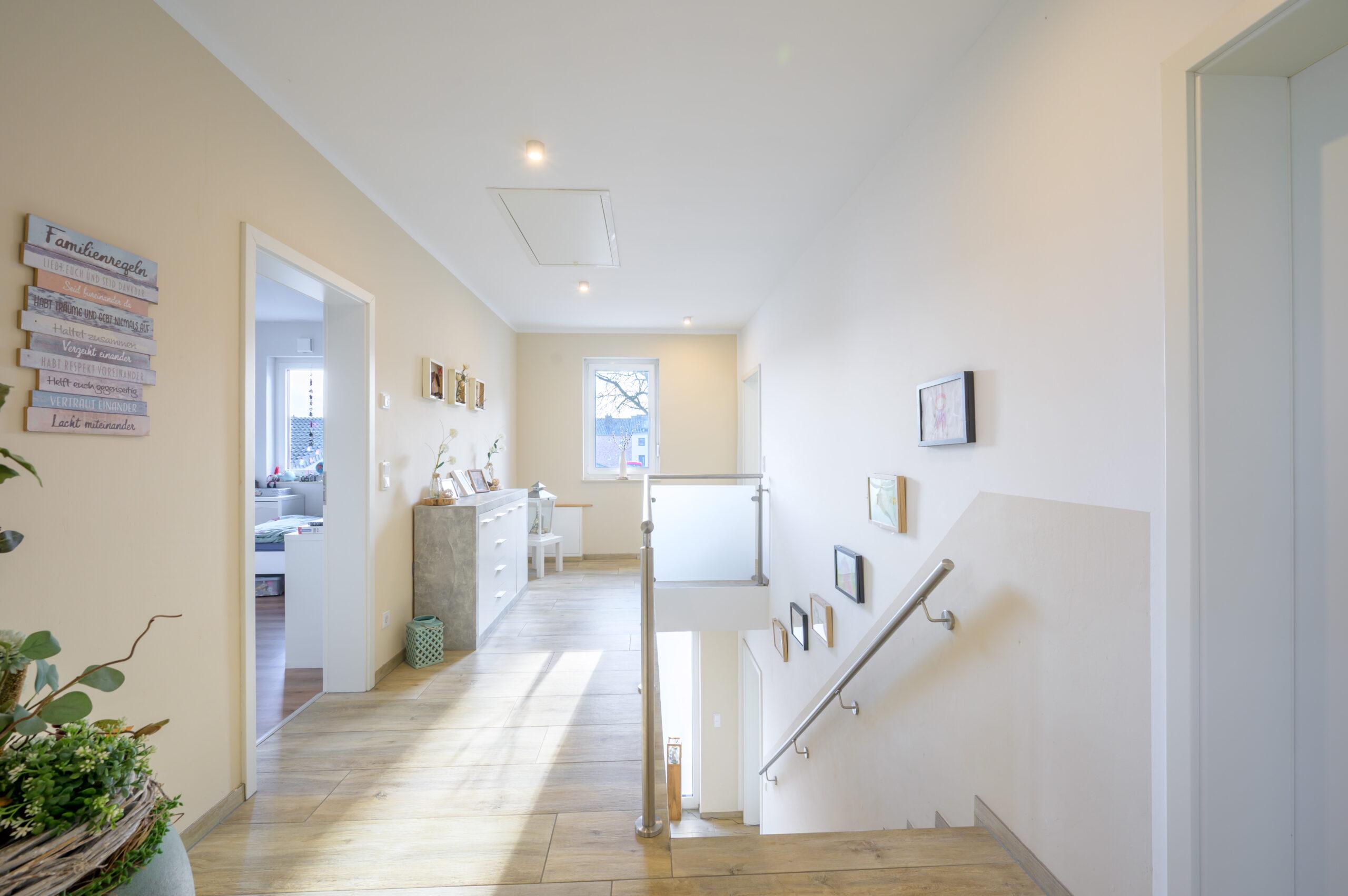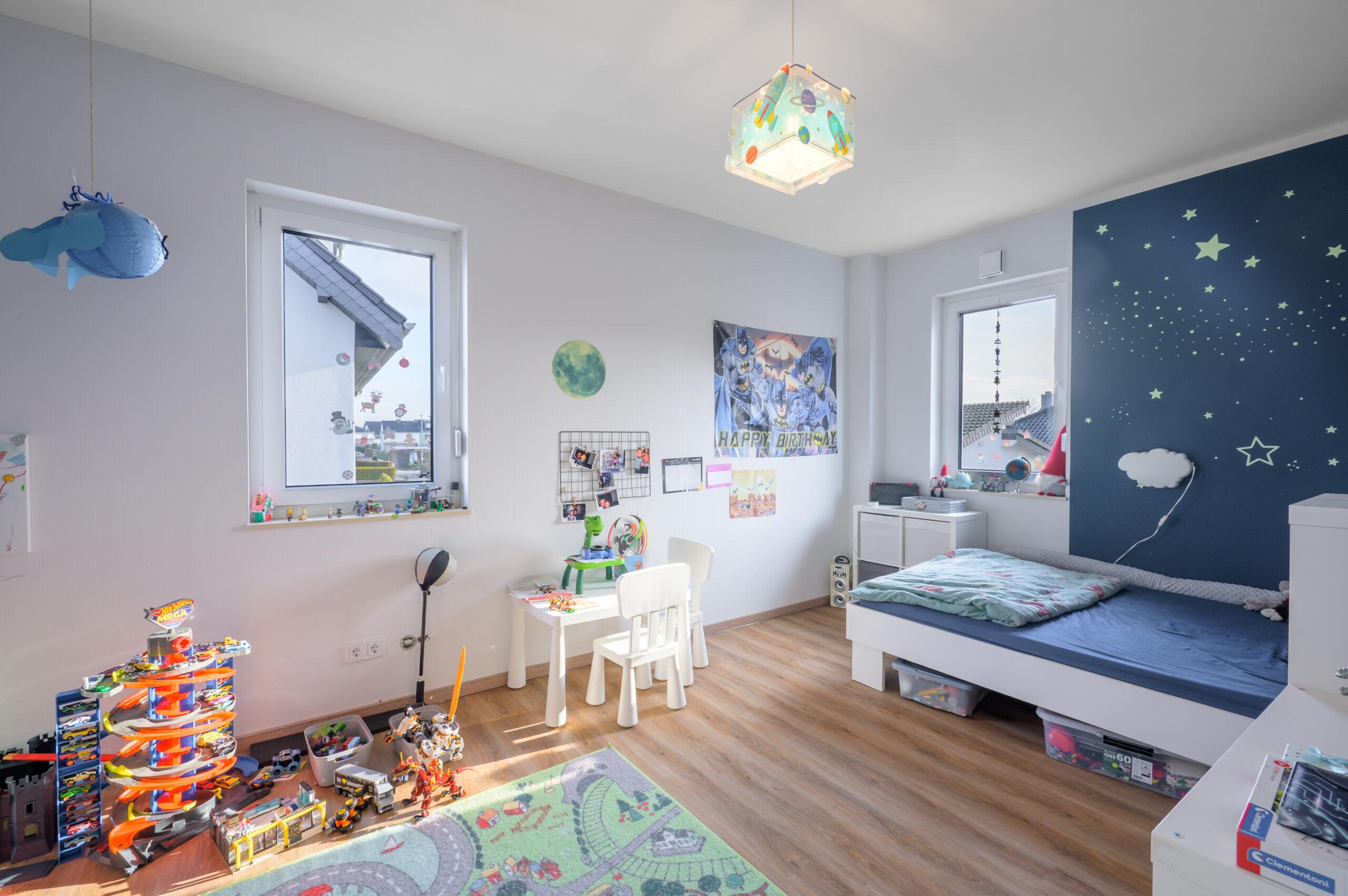 Im Obergeschoss befinden sich das Elternschlafzimmer, zwei gut geschnittene Kinderzimmer sowie ein modernes Tageslichtbad mit Badewanne und bodengleicher Dusche. Die Raumaufteilung ist funktional und familienfreundlich gestaltet.