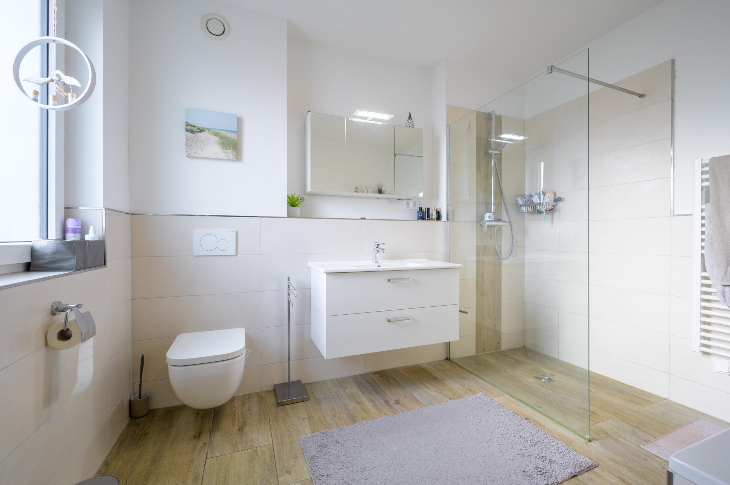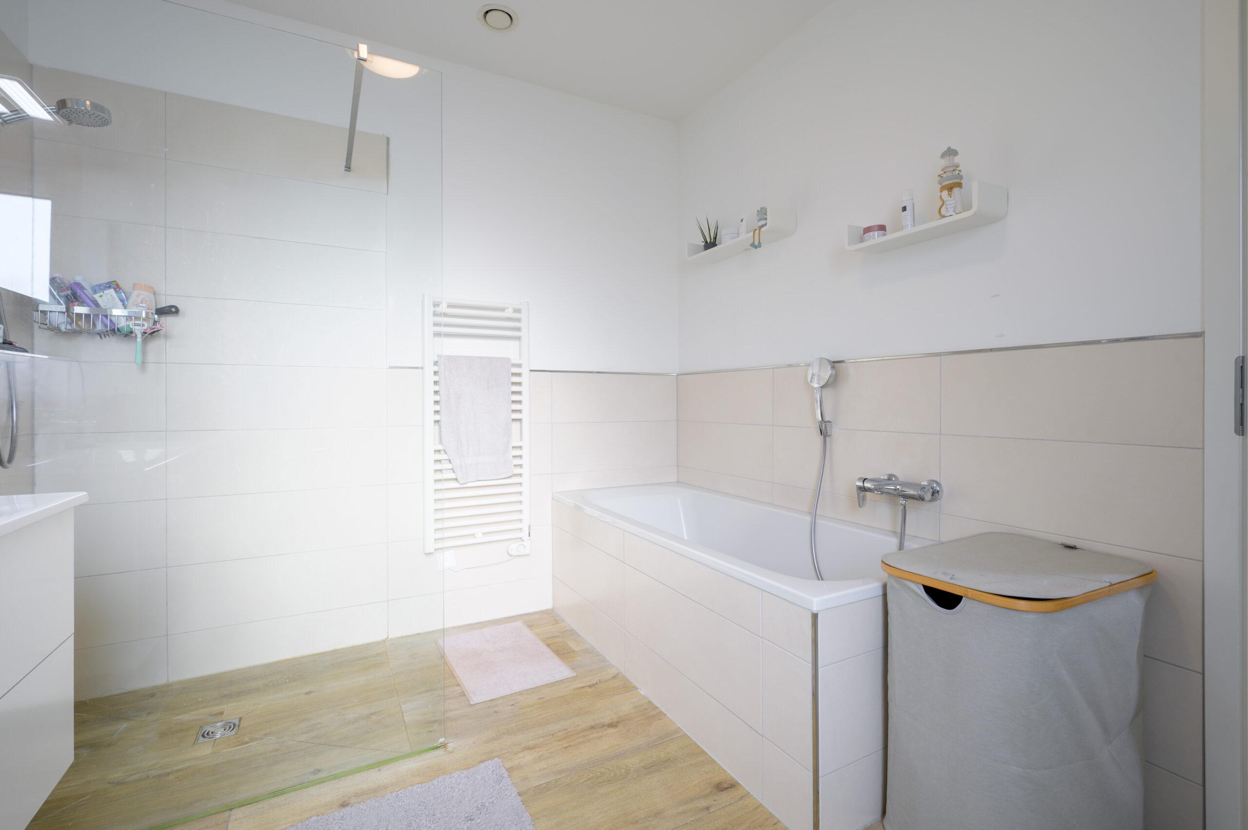 Badezimmer: ein großes Familienbad mit Wanne und bodengleicher Dusche im OG