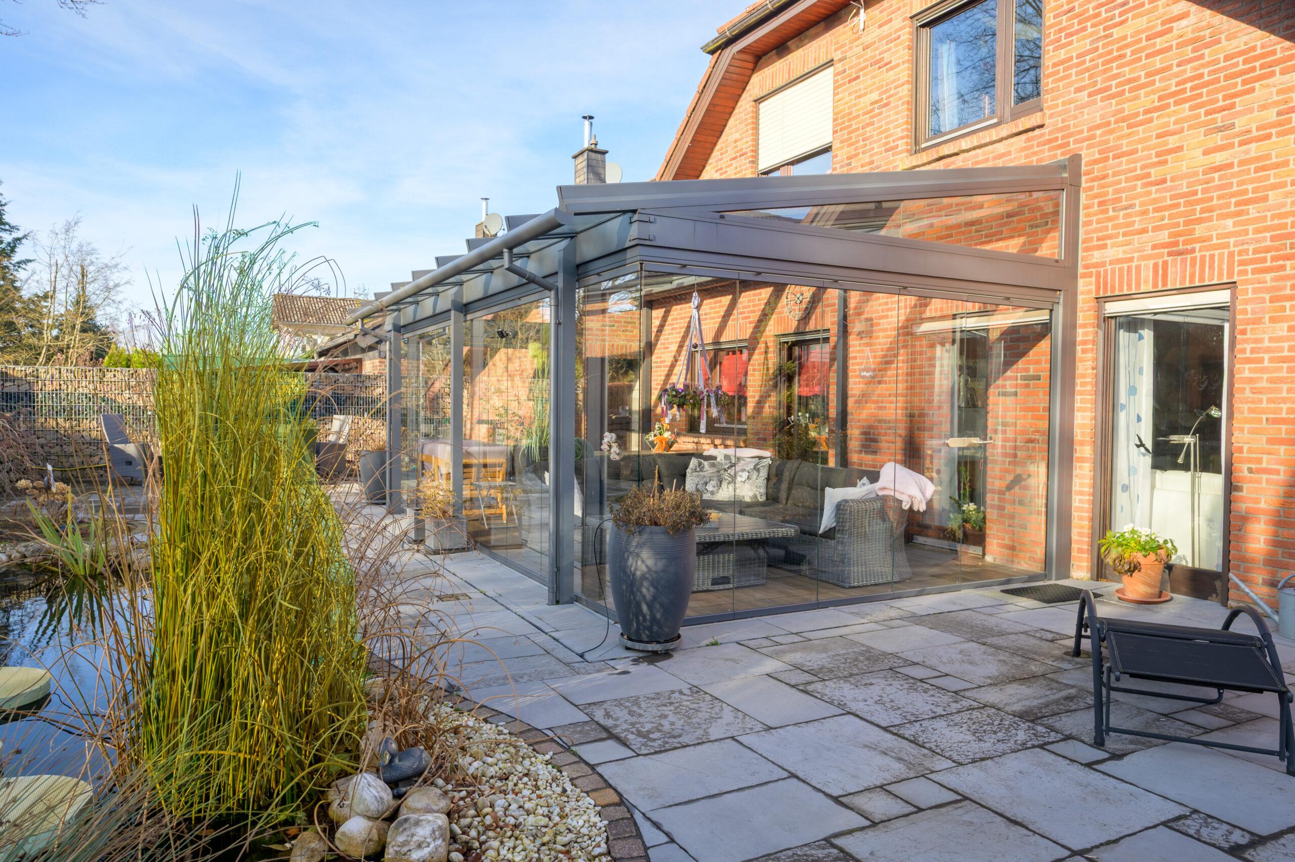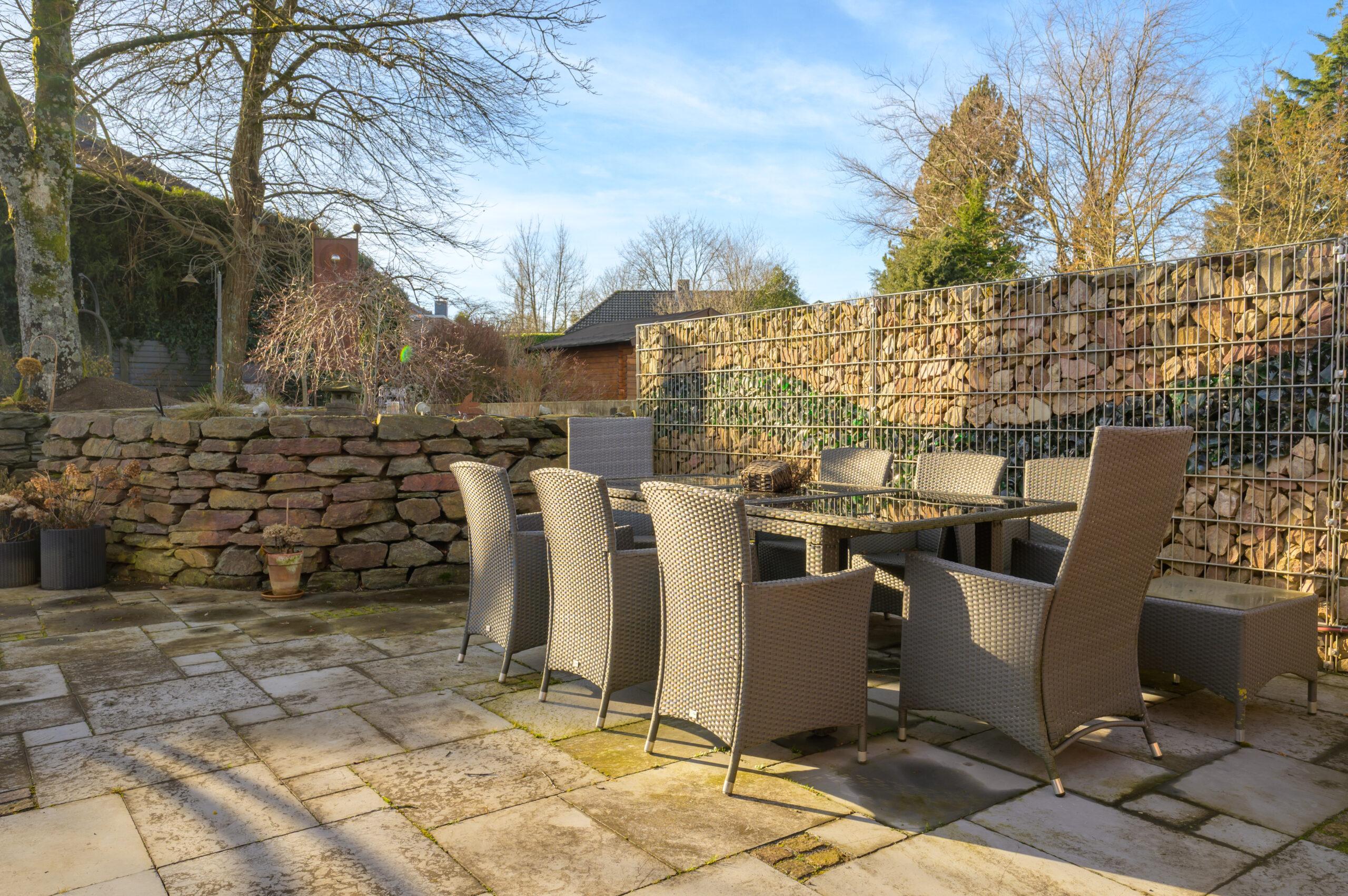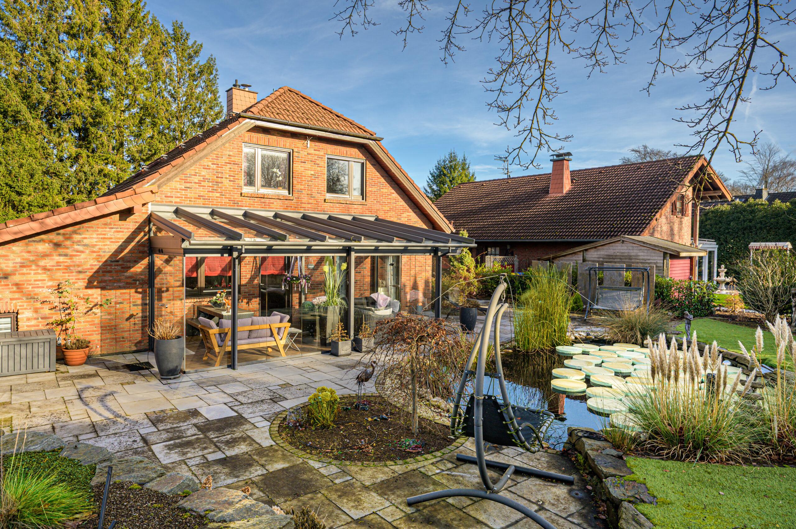 Der Garten, 2017 nach moderaten Feng-Shui-Prinzipien von einer Landschaftsarchitektin gestaltet, ist ein echtes Highlight. Ein großes Glashaus mit Sonnenschutz, ein Koiteich mit beeindruckendem Besatz, eine Gardena-Bewässerungsanlage mit über 100 Wasserstellen sowie stimmungsvolle Außenbeleuchtung schaffen eine einzigartige Wohlfühlatmosphäre – dank Südwest-Ausrichtung zu jeder Jahreszeit. Auch der neu angelegte Vorgarten mit großzügiger Zu- und Abfahrt bietet Platz selbst für ein großes Wohnmobil und ist attraktiv beleuchtet.