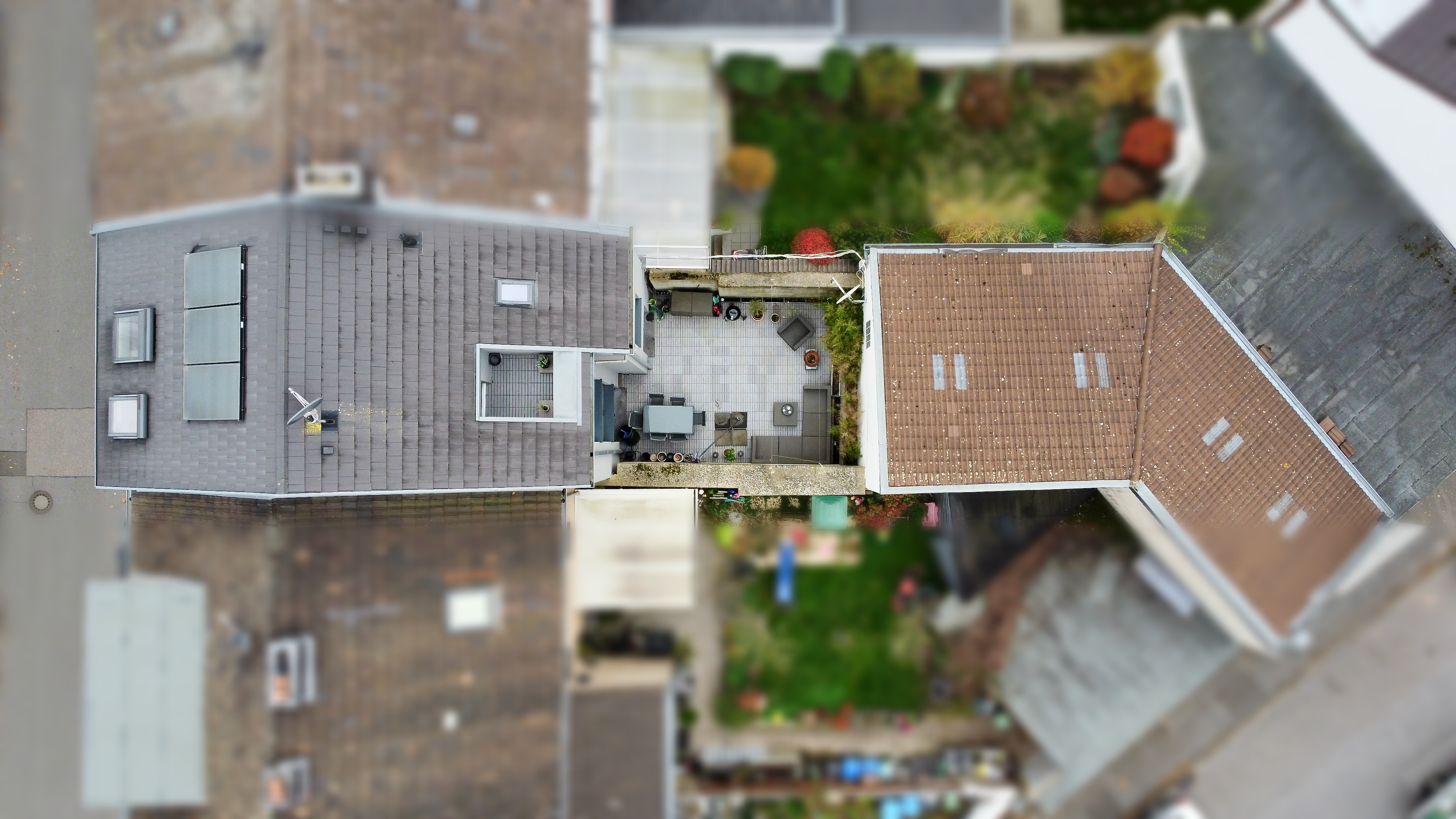 Der modern eingefasste Terrassengarten auf der Rückseite des Hauses ist vollständig mit hochwertigen Terrassenplatten gestaltet und bietet durch seine geschützte Lage ein äußerst privates Ambiente. Er eignet sich ideal für entspannte Sonnenstunden, gesellige Grillabende oder gemütliche Abende im Freien – ganz ohne aufwendige Pflege.