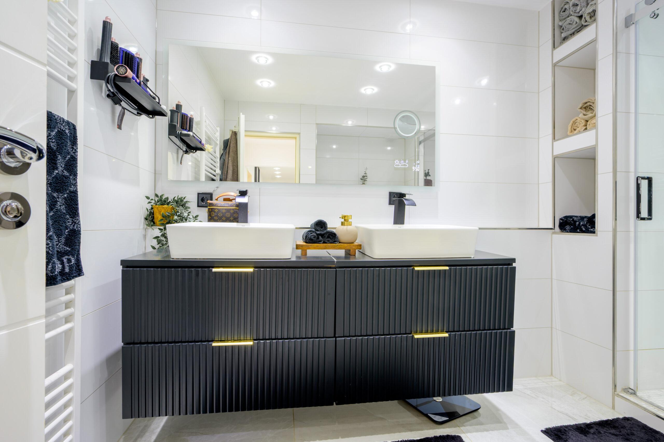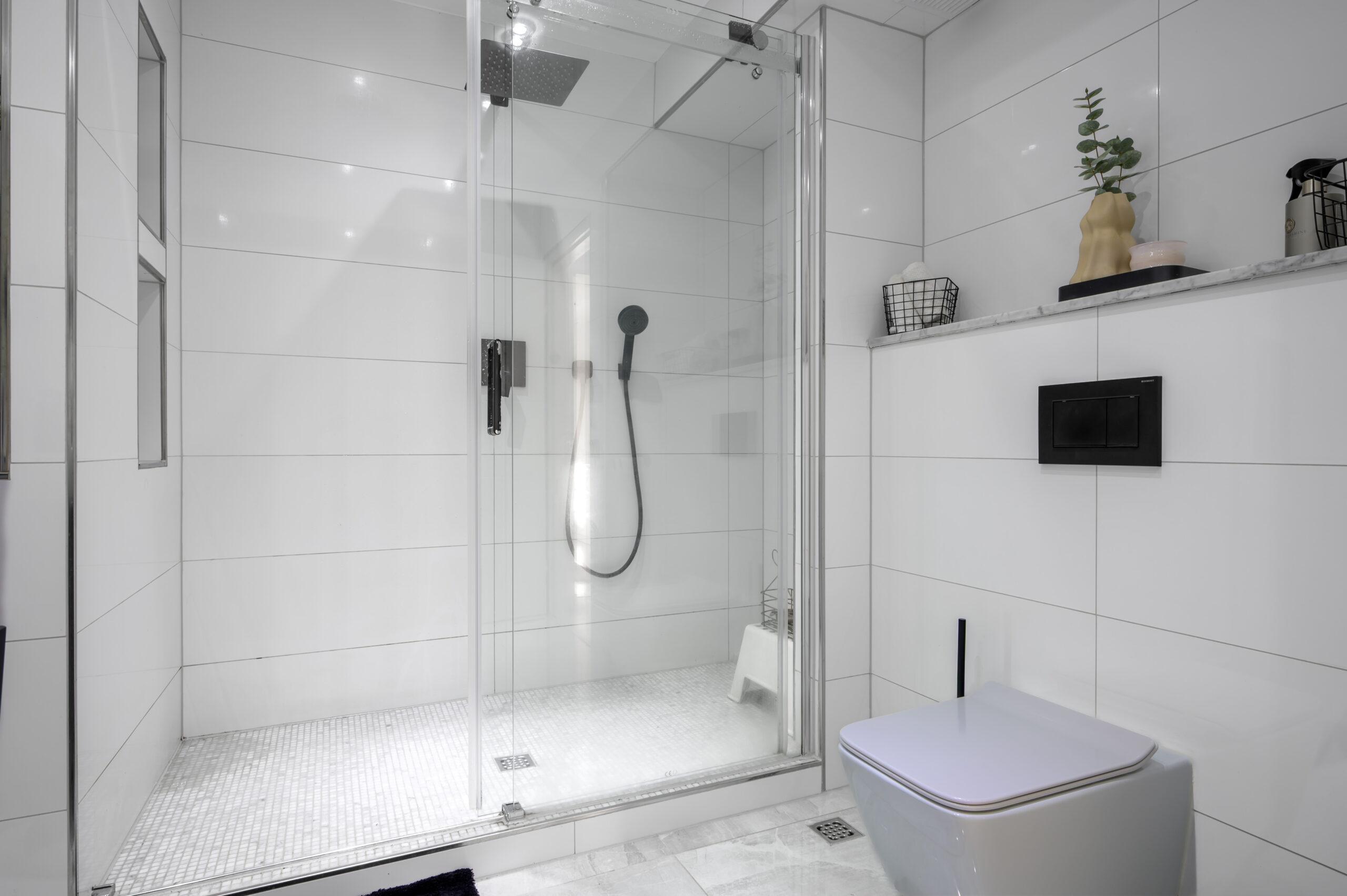 Das im Zuge der Sanierung komplett modernisierte Badezimmer präsentiert sich in einem geschmackvollen Design mit hochwertigen Armaturen und eleganten Fliesen. Eine praktische Abstellkammer bietet zusätzlichen Stauraum und rundet das funktionale Raumkonzept ab.